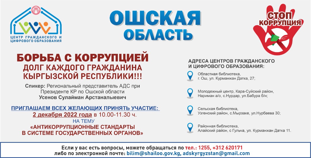 2 декабря 2022 года в 10.00-11.30 ч. на тему «Антикоррупционные стандарты в системе государственных органов» в следующих Центрах гражданского и цифрового образования Ошской области: