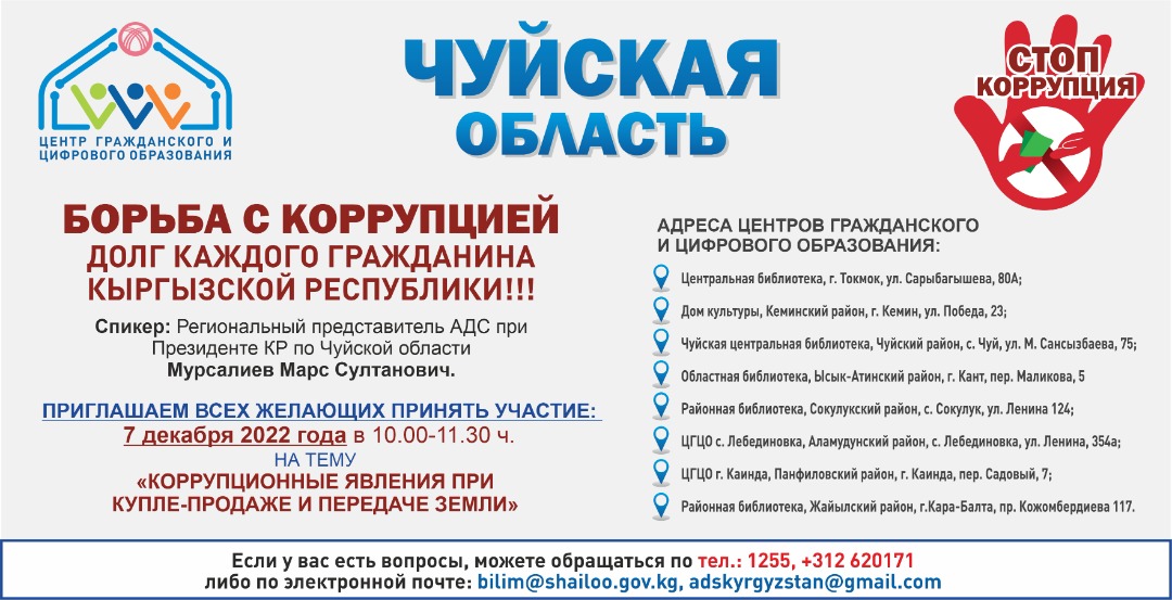 7 декабря 2022 года в 10.00-11.30 ч. на тему «Коррупционные явления при купле-продаже и передаче земли» в следующих Центрах гражданского и цифрового образования Чуйской области: