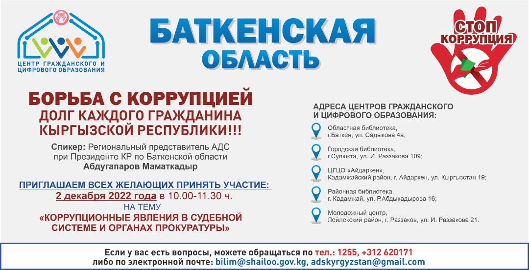 2 декабря 2022 года в 10.00-11.30 ч. на тему «Коррупционные явления в судебной системе и органах прокуратуры» в следующих Центрах гражданского и цифрового образования Баткенской области: