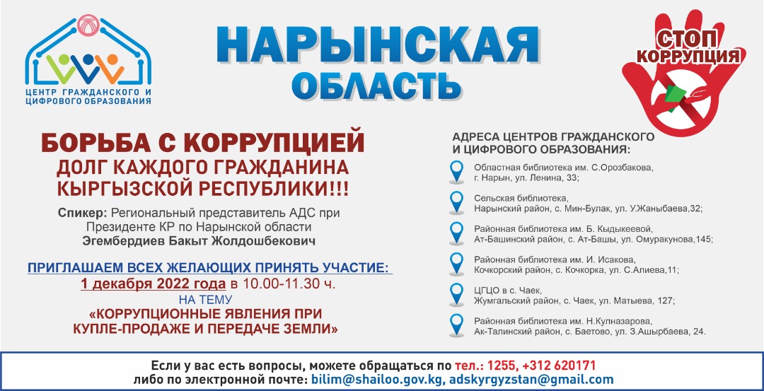 1 декабря 2022 года в 10.00-11.30 ч. на тему «Коррупционные явления при купле-продаже и передаче земли» в следующих Центрах гражданского и цифрового образования Нарынской области: