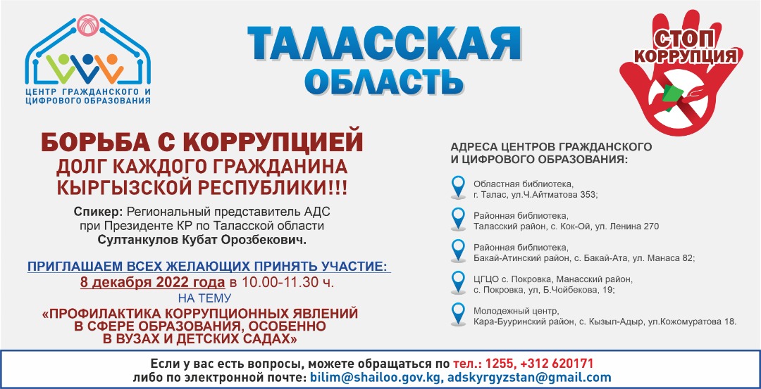 8 декабря 2022 года в 10.00-11.30 ч. на тему «Профилактика коррупционных явлений в сфере образования, особенно в вузах и детских садах» в следующих Центрах гражданского и цифрового образования Таласской области: