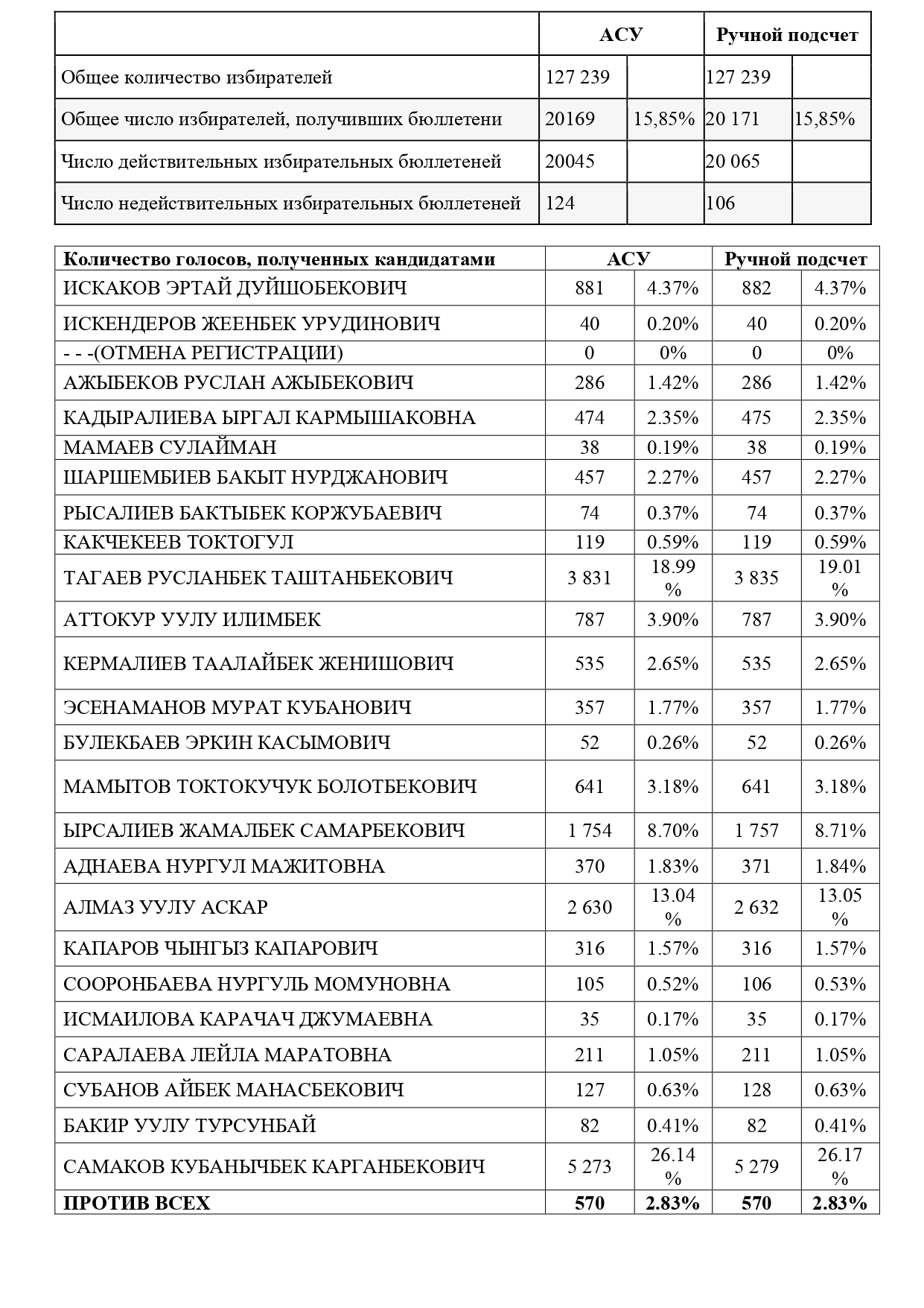 Предварительные итоги голосования на повторных выборах депутата Жогорку Кенеша по Ленинскому округу №26 – по данным АСУ и ручного подсчета