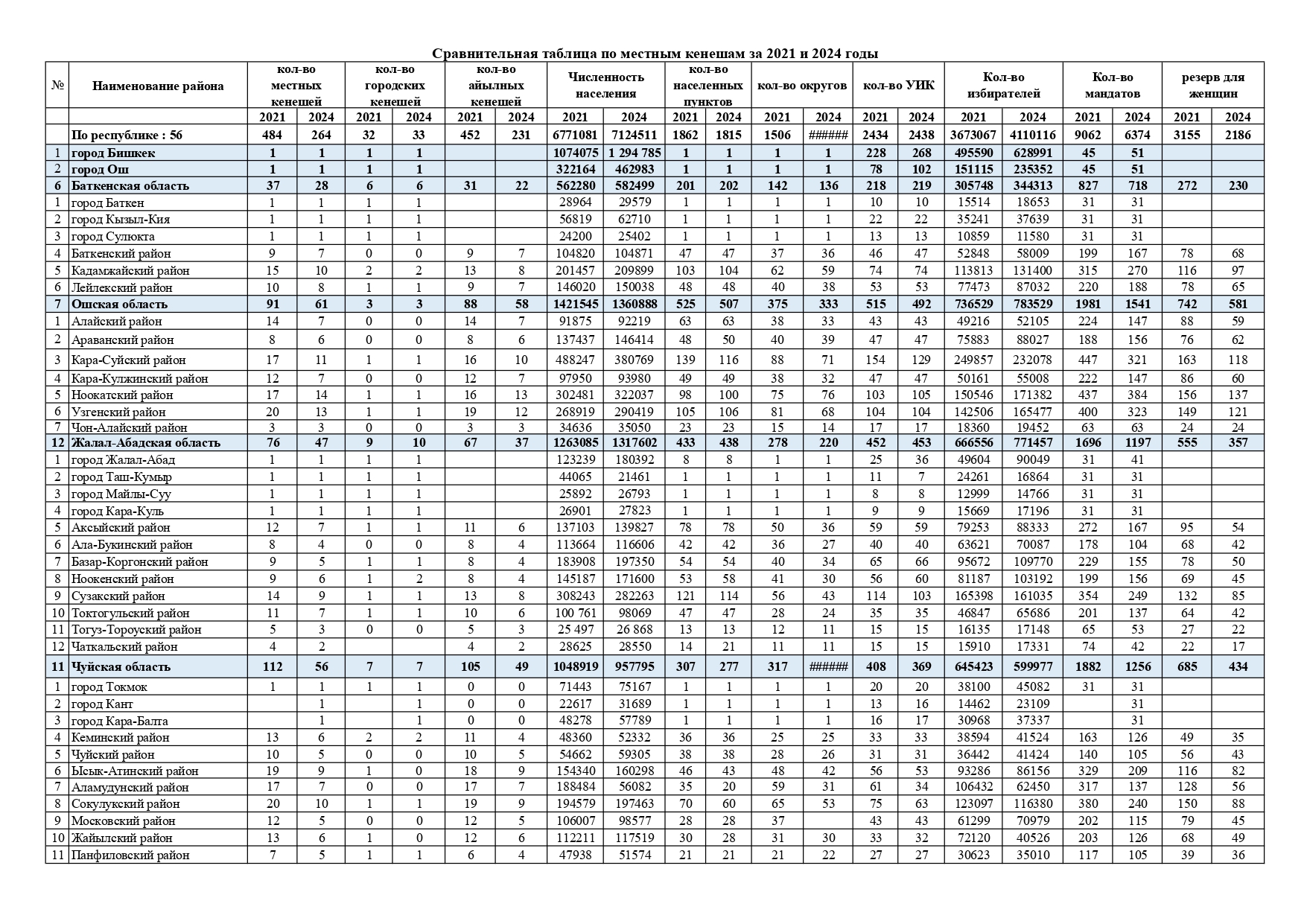 Согласно утвержденному календарному плану, на основе предложений органов МСУ, территориальные избирательные комиссии разработали схемы и границы избирательных округов по выборам депутатов местных кенешей, с учетом резервирования мандатов депутатов айылных кенешей для женщин не менее 30%, которые направили на утверждение в Центральную избирательную комиссию. ЦИК до 28 сентября 2024 года (не позднее, чем за 50 календарных дней до дня голосования) утвердил схемы и границы избирательных вышеобозначенных округов для проведения выборов депутатов местных кенешей.