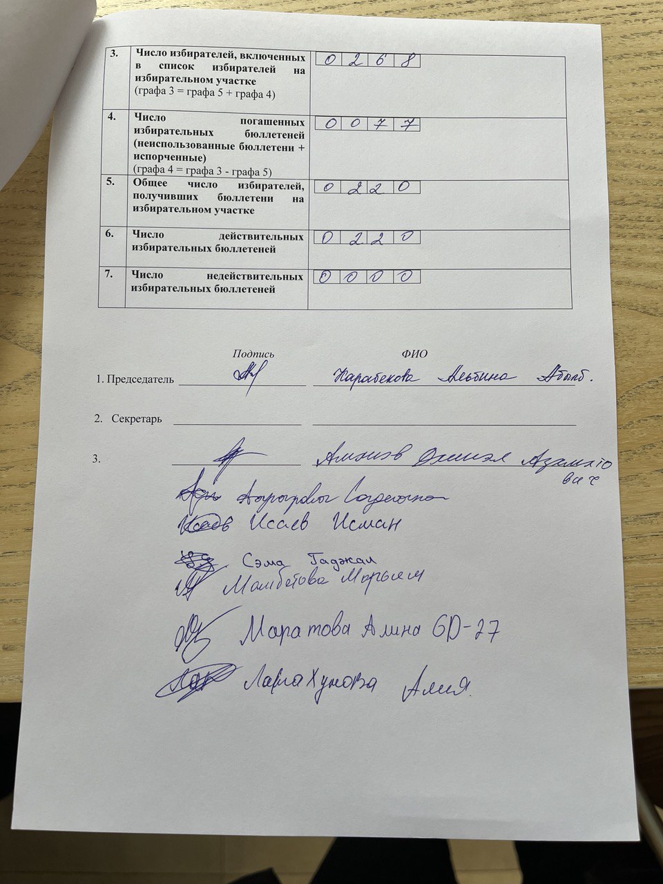 - кандидат Сулаида Нишанбаева получила 10 голосов, что составляет 4,5 % от числа избирателей, принявших участие в выборах.