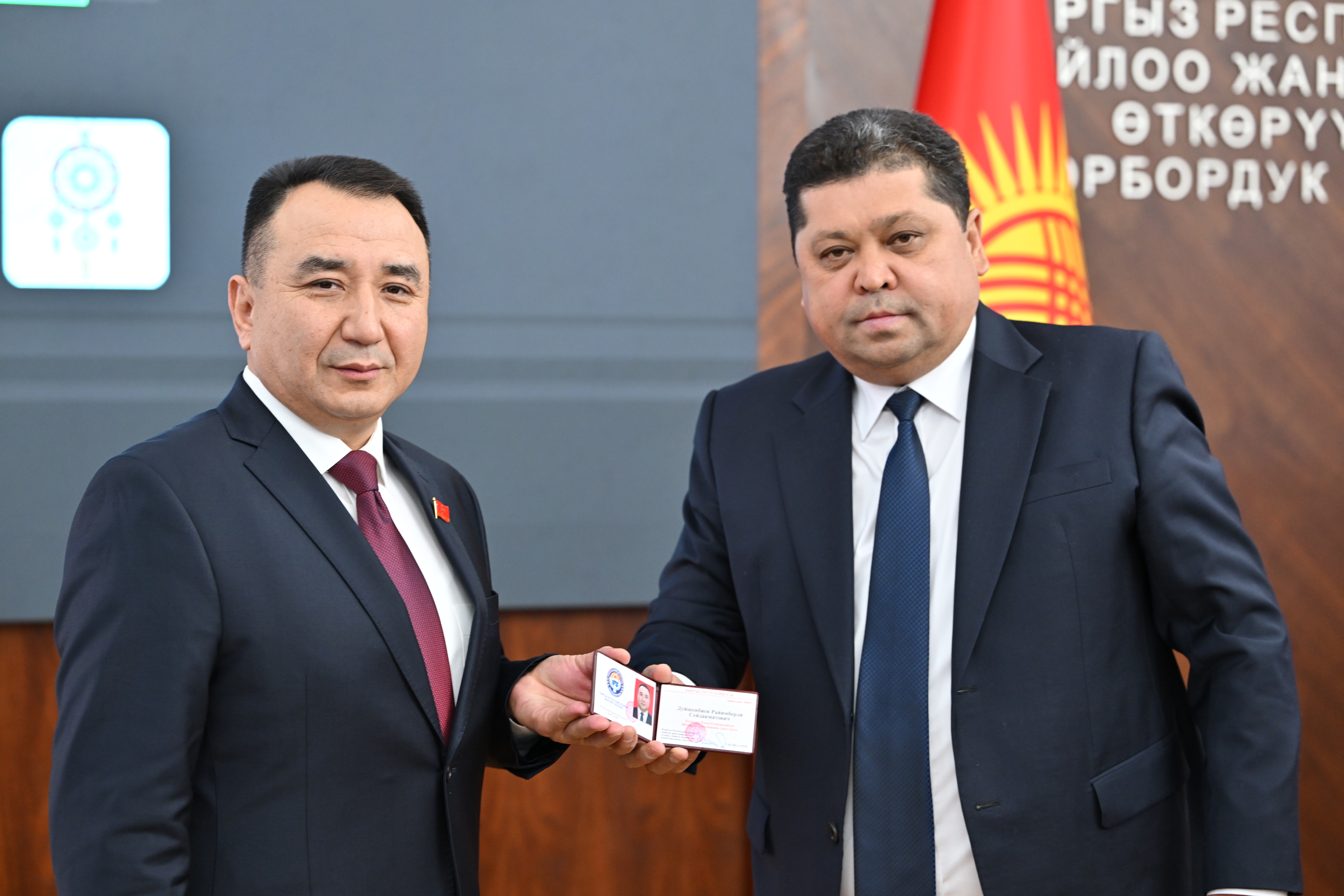 Р.С. Дуйшенбиев зарегистрирован депутатом Жогорку Кенеша КР по избирательному округу №14, Дж.Д. Нышанов - по избирательному округу №15. Им вручены удостоверения установленного образца и нагрудные знаки депутата.